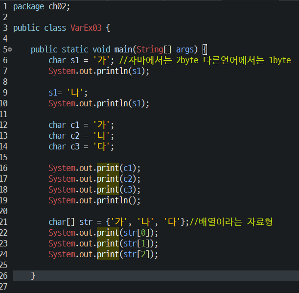 char[] str = {'가', '나', '다'}; 연속된 메모리 공간 정해져 있는(고정적)