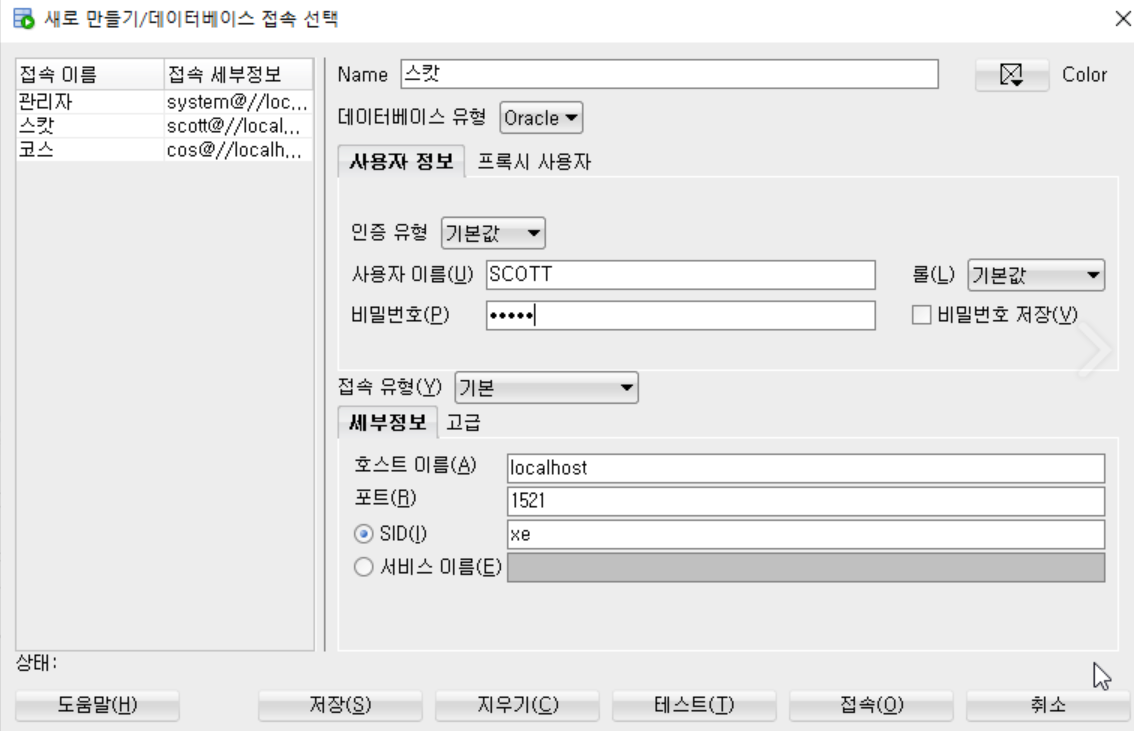 먼저 관리자 페이지에서 스캇 유저를 생성하고 세션 테이블스페이스 테이블 권한을 준다