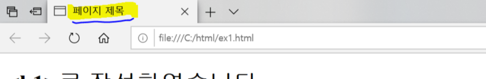 <html> <!--이 부분은 주석문입니다. 화면에는 출력되지 않습니다.--> <head> <!--이 부분은 제목, 본문을 설명으로 메타 태그들과 자바스크립트 코드, CSS 스타일 시트 등이 들어가고 본문에는 포함되지 않습니다.--> <title>페이지 제목</title> <!--<title>태그는 <head>태그의 하위 태그이고 내용에는 페이지 제목을 적습니다. </head> <!--<head>와 <body> 태그 사이에는 아무것도 들어갈 수 없다.--> <body> 본문 </body> </html>