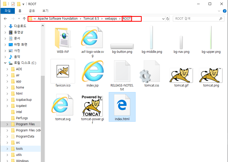 우측 아래에 있는 아이콘으로 아파치톰켓을 Start하면 root파일(아파치톰캣의 기본폴더)을 웹서버로 만드는 것임.